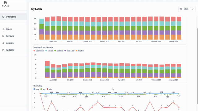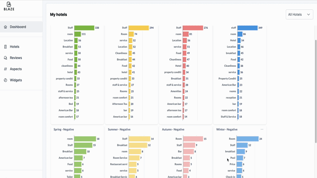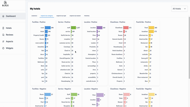 We are not satisfied with the general score and sentiment. Blaze dives deep into all the layers of the reviews and pulls out ALL the aspects and opinions of your guests so you can see the real picture.